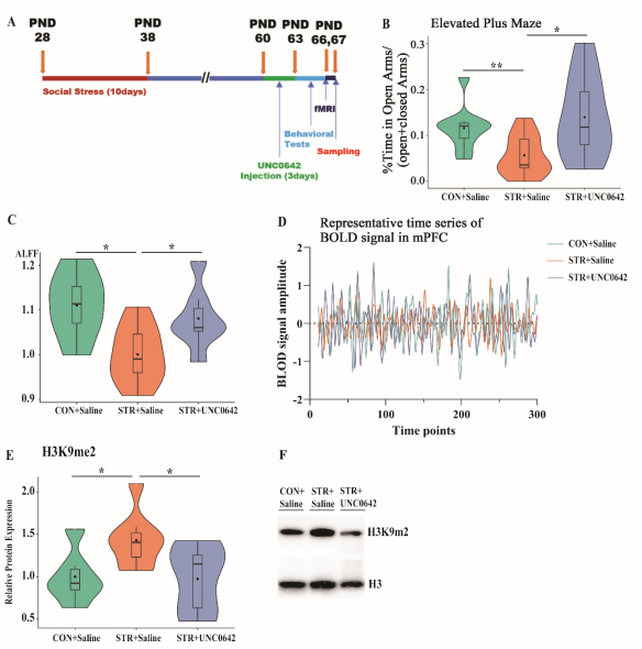 图4.特异性H3K9m2抑制剂UNC0642逆转了应激诱导的成年小鼠mPFC区域的ALFF降低和H3K9me2升高,并改善了其焦虑水平