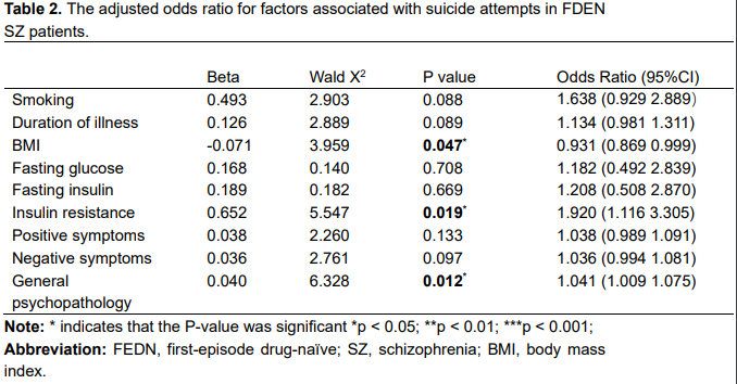 研究结果发现,与无自杀行为的患者相比,有自杀行为的患者有更加严重的抑郁症状、阳性症状,并且具有更高的空腹血浆葡萄糖水平、空腹血浆胰岛素水平以及胰岛素抵抗指数。胰岛素抵抗水平增加、BMI、和PANSS一般病理学症状与自杀行为独立相关。
