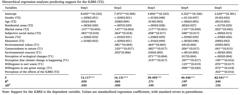 研究人员以负责任环境行为模型为理论基础,利用大样本纵向调研数据,建立了三层次模型,从而深入探讨了影响公众支持碳普惠的心理和社会因素。通过对数千名受访者的追踪调查,该研究揭示了不同地区受访者对于碳普惠政策的支持程度(图1),发现了环境态度、气候变化感知及对其他环保政策支持度等因素对碳普惠政策支持的显著稳定影响(图2)。纵向调研设计排除了同一时间点不同变量之间可能的相互作用,从而更直接地证明独立变量的稳定预测能力,有助于准确地揭示公众支持碳普惠政策背后的影响因子。该研究不仅为理解公众对环保政策的态度提供了新视角,也为设计和推广低碳奖励措施提供了科学依据。