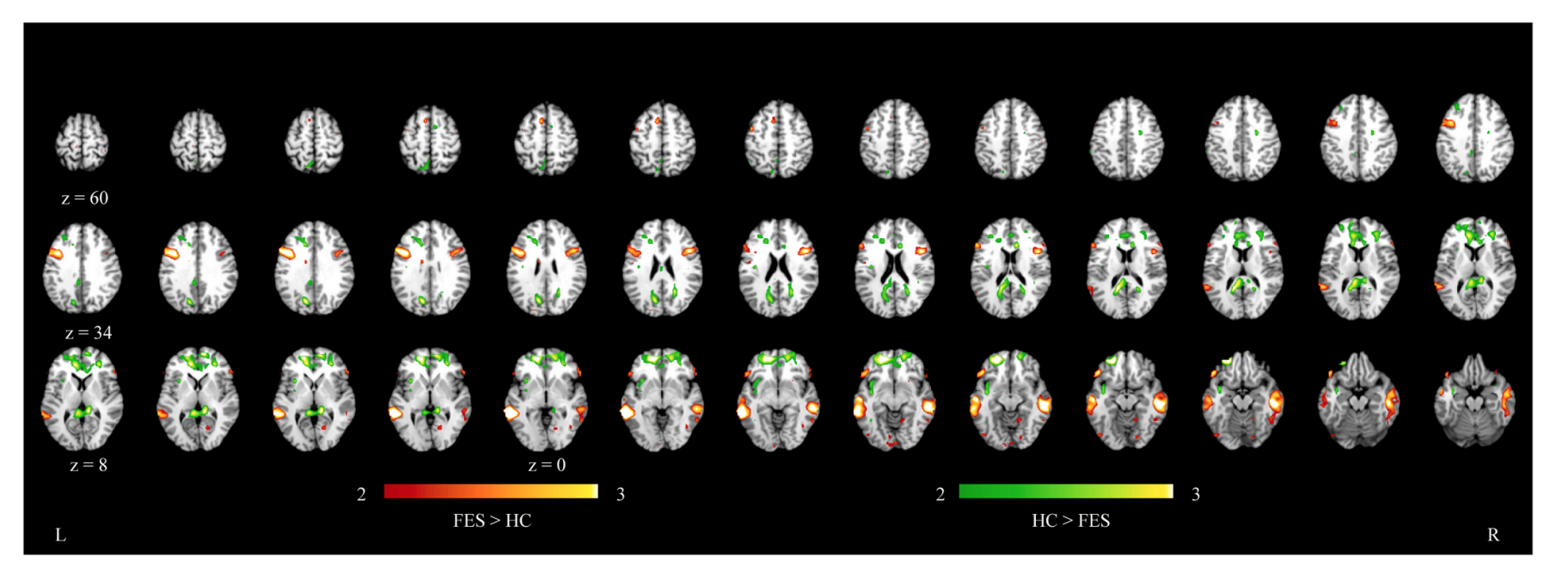 图2. 首发精神分裂症患者与健康对照组在幽默与非幽默条件对比中的神经活动差异