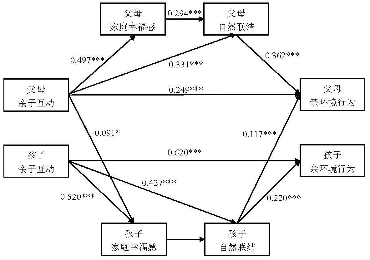 研究发现,亲子互动对代际关系和家庭幸福有积极影响,互动程度越高,父母和孩子所感受到的家庭幸福感越强、自然联结水平越高。幸福的人更有可能表现出亲环境行为。因此,人们的亲环境行为会受到家庭幸福感的影响,即亲子互动增加父母和孩子的家庭幸福感及自然联结,进而促进亲环境行为的提升。