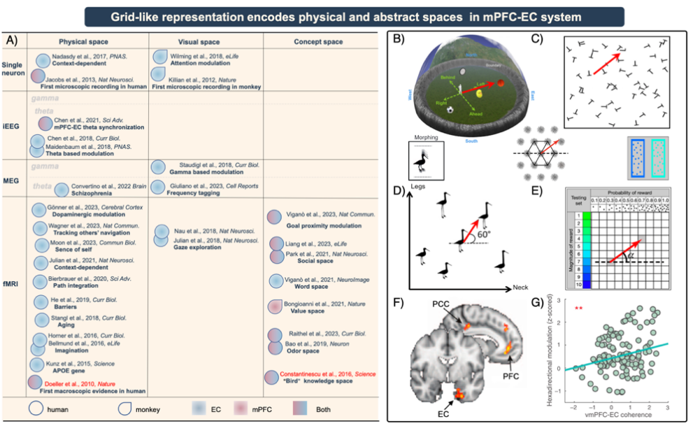 图2. 跨模态(单细胞-场电位-功能核磁)、跨脑区(内嗅-后顶叶-前额叶)、跨任务域(物理空间-视觉空间-概念空间)的人类网格表征研究