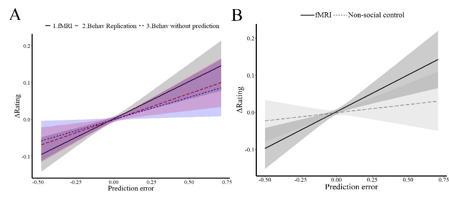 注:(A)在降低了社会赞许性和指令效应的影响下,观察学习误差仍能类似地推动个体共情的改变。(B)观察学习误差对个体共情的推动作用会因为观察对象从人类替换为计算机而大幅度降低。