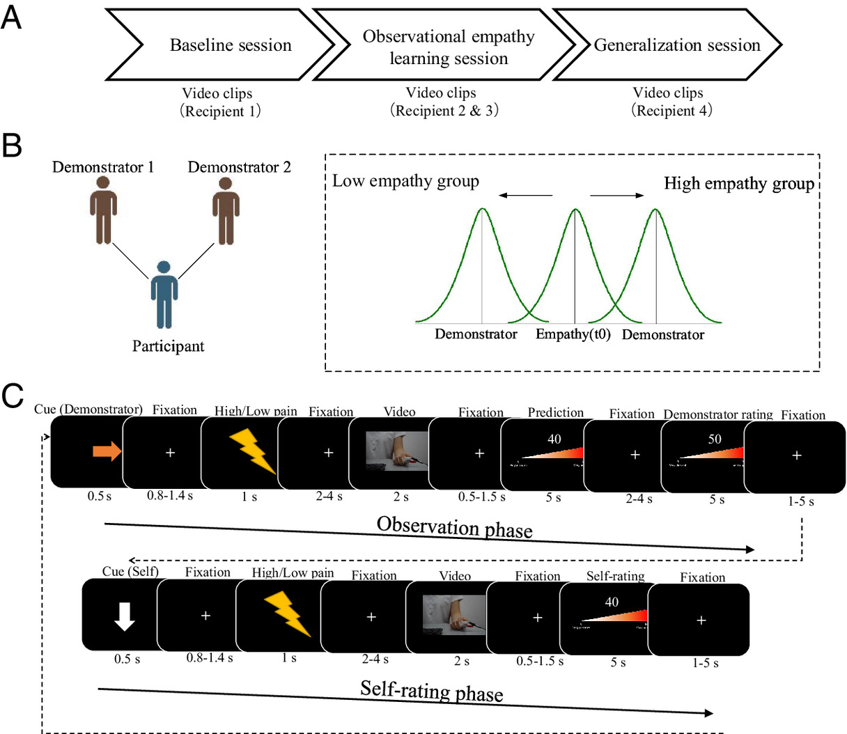 注:(A)实验分为基线期、观察学习期与泛化期。(B)在观察学习期,被试将被随机分配到高共情组或低共情组。在高/低共情组,观察对象对他人疼痛视频的主观评价将比被试在基线期的主观评价高/低。(C)观察学习期试次说明。每一试次分为观察阶段和自我打分阶段,观察阶段个体需要预测他人的主观评价,并得到反馈。在自我打分阶段,被试仅需汇报自己看到他人遭受痛苦时的内心感受。