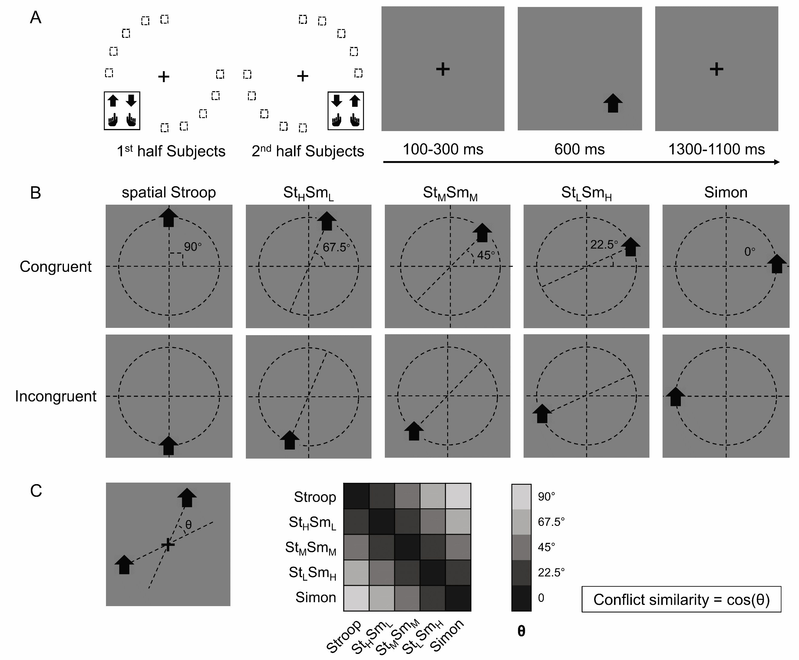 该研究探索了一种新的可能性,即认知控制不是简单的二分,而是一个连续体,存在介于一般性和特异性之间的中间状态。这种新的表征形式符合“认知空间”理论,即不同条件间的表征存在连续性,且其位置由条件间的相似性关系决定。因此,研究者将这种可能性称为认知控制的“认知空间理论”。为验证这一理论,研究者对冲突任务进行了参数化设计。在空间Stroop-Simon范式中,研究设置了三种中间状态条件,每种条件包含一定程度的空间Stroop成分和Simon成分(图1)。这五种条件之间呈现逐渐变化的相似性趋势。根据“认知空间”理论,认知控制的表征会受这种参数化设置的线性调节。