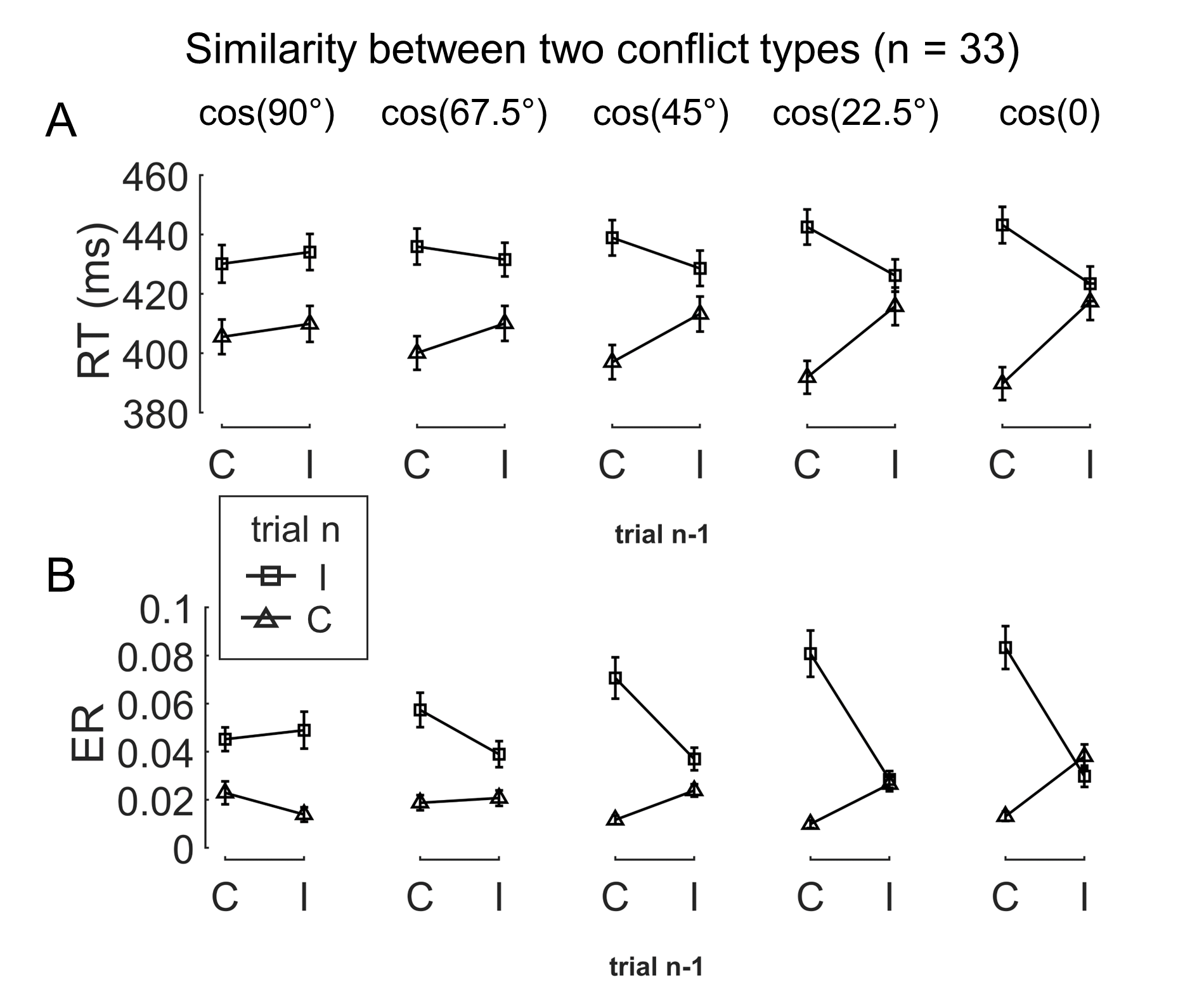 图2. 冲突任务之间的冲突适应效应随着相似性增加而增大