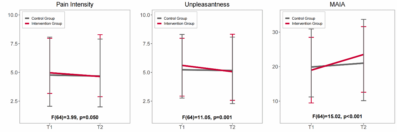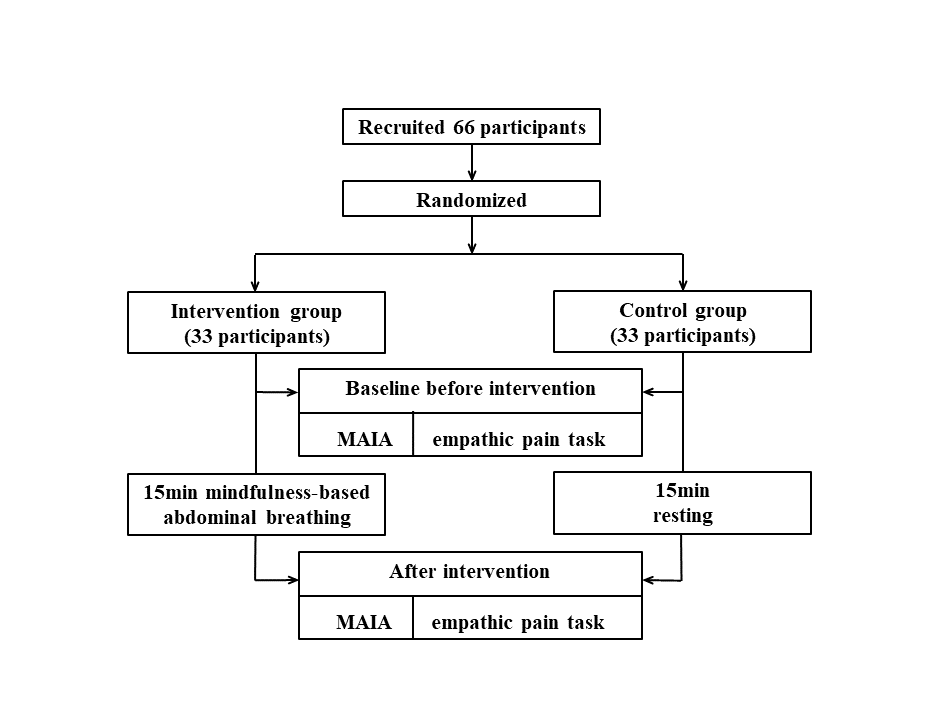 研究采用随机对照试验(RCT)设计,分为干预组和对照组。干预组进行了15分钟的腹式呼吸干预训练,对照组休息15分钟且不进行任何干预。在基线和干预结束,分别测量了所有被试在观看他人疼痛图片后的疼痛强度和不愉悦度评分,以及内感受敏感性(MAIA)得分。