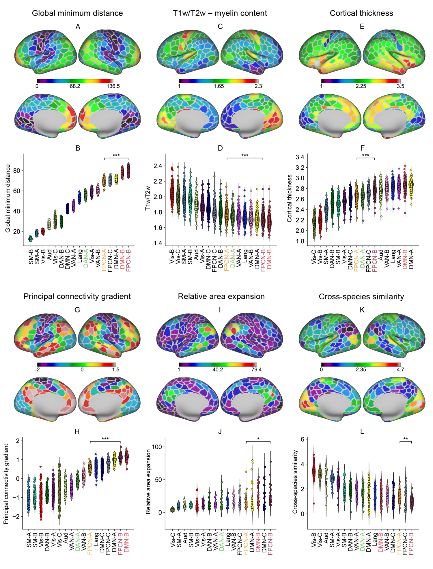 前人研究发现,额顶控制网络FPCN可分为两个子网络,FPCN-A和FPCN-B。该研究首先发现,这两个子网络在拓扑组织模式上存在系统差异:FPCN-A更靠近感知觉皮层和背侧注意网络(dorsal attention network,DAN),FPCN-B更靠近负责长时记忆的默认网络(default mode network,DMN)(图1)。这些拓扑上的差异不仅体现在物理距离上,还表现在解剖层级、功能层级和进化层级上(图1)。