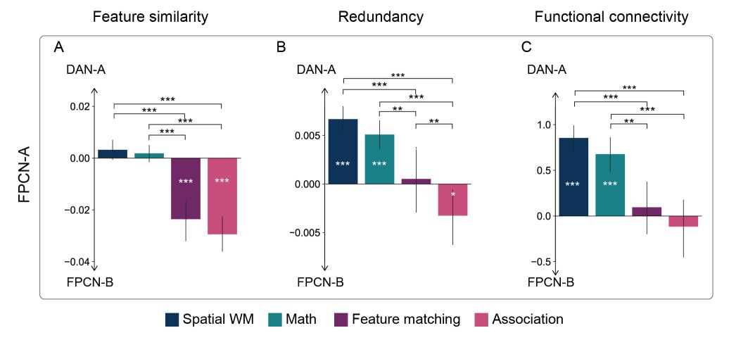 研究还发现,额顶控制网络的两个子网络FPCN-A和FPCN-B在拓扑组织模式上的位置与它们的交互模式相对应。FPCN-A更靠近DAN,也与其有更强的协作关系;FPCN-B更靠近DMN,也与其有更强的协作关系(图2)。这种协作模式主要体现在三个方面:特征相似性、信息共享和功能连接(图2)。