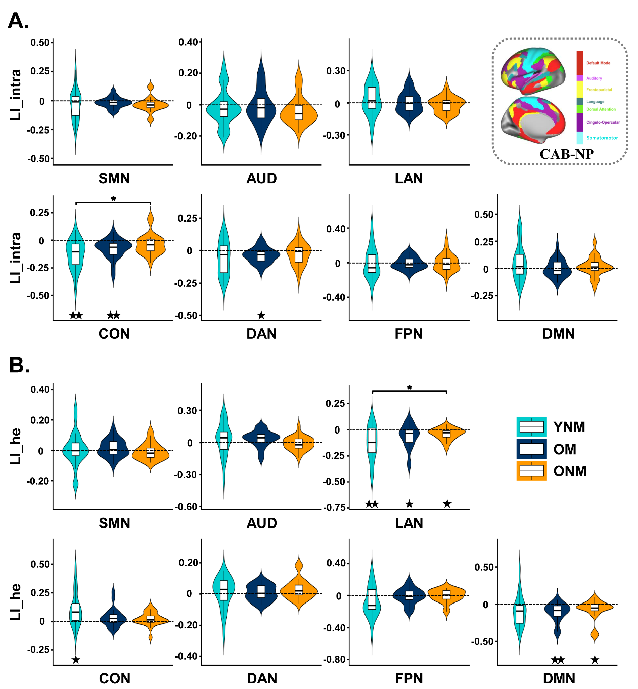 图 2 三组被试的脑网络功能偏侧化。A. 半球内功能连接偏侧化LI_intra。B. 半球间异位功能连接偏侧化LI_he。CAB-NP: Cole-Anticevic Brain-wide Network Partition. SMN:感知运动网络;CON:伞盖网络;DAN:背侧注意网络;LAN:语言网络;AUD:听觉网络;DMN:默认网络;FPN:额顶控制网络。YNM:青年非音乐家;ONM:老年非音乐家;OM:老年音乐家。* FDR-corrected or Games-Howell-corrected P < 0.05. ★FDR-corrected P < 0.05, ★★FDR-corrected P < 0.01。
