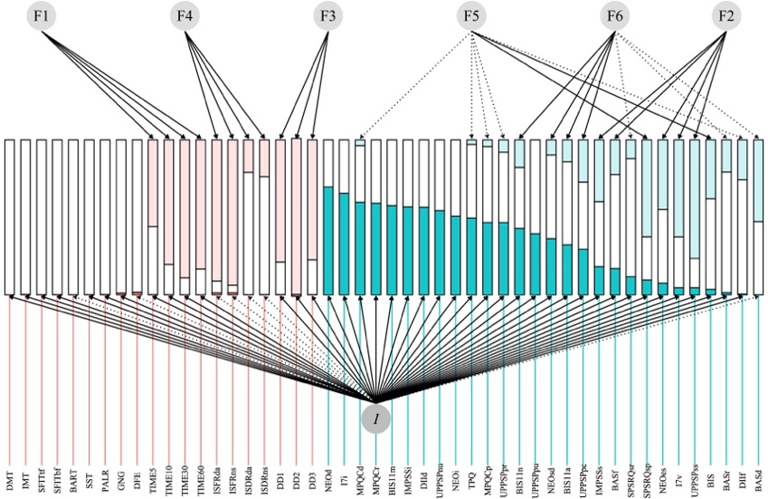 图1. 冲动性的双因子模型。蓝色为自我报告量表指标,红色为行为测量指标。I代表提取的一般冲动性因子,F1至F6为特殊因子。每个指标条上部的浅色部分代表可由特殊因子解释的变异;下部的深色部分代表可由一般因子I解释的变异;中间的白色部分代表无法被解释的变异。虚线箭头表示负载荷,实线箭头表示正载荷