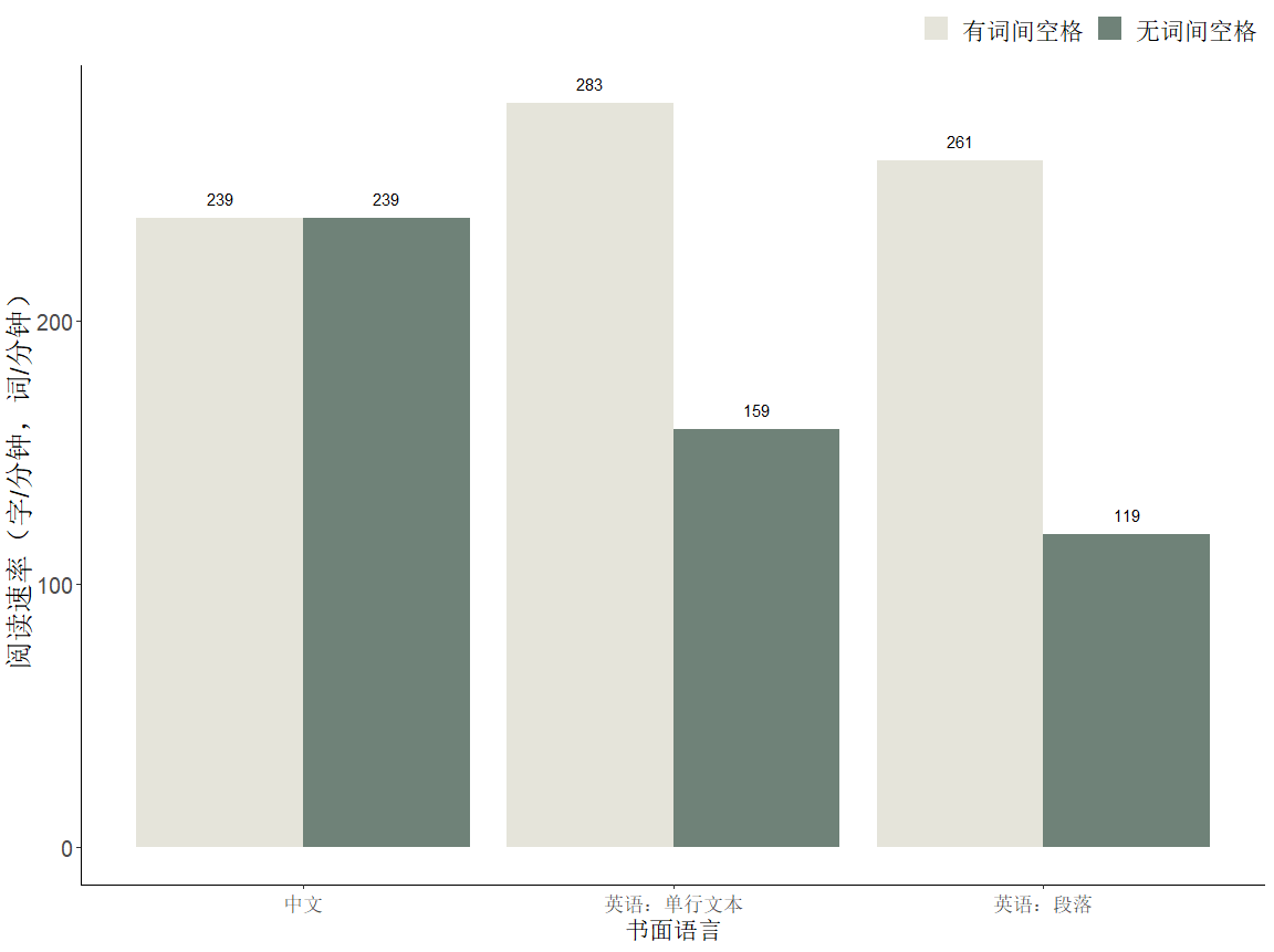 与该研究的假设一致,以往研究表明,改变词边界的标记方式对不同语言读者的阅读效率产生了不同影响。这些研究发现,在空格信息量较大的书写系统(如英语)中去掉空格,阅读速率大幅下降约50%;而在空格信息量较小的书写系统(如中文),即使插入空格,阅读速率也不会显著提升(如图3所示)。
