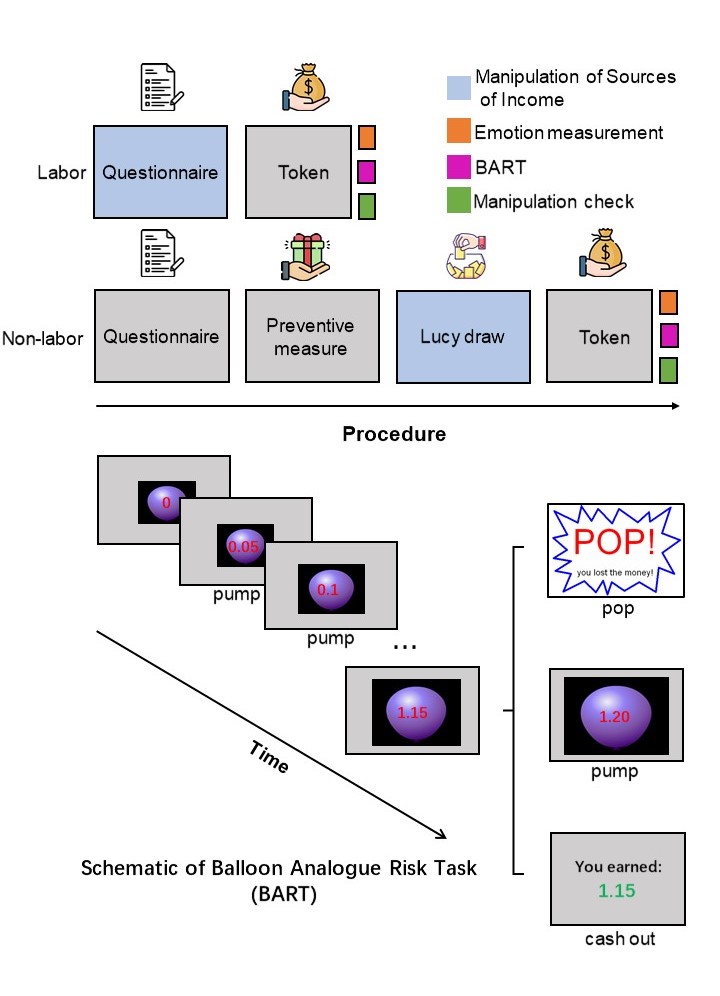 该研究招募了172名被试,通过发放被试费或相同数目的抽奖奖金两种形式,将金钱来源操纵为 “劳动所得”或“意外之财”。随后通过观察被试使用这些金钱资产进行动态风险投资任务即BART的表现, 以探究两种金钱来源资产如何影响个体的动态风险决策(图一)。