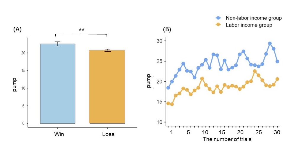 图 2(A)上一轮气球是否爆炸的反馈对下一轮游戏风险偏好的影响;(B)劳动所得与意外之财金钱来源下个体吹气球次数的逐轮比较