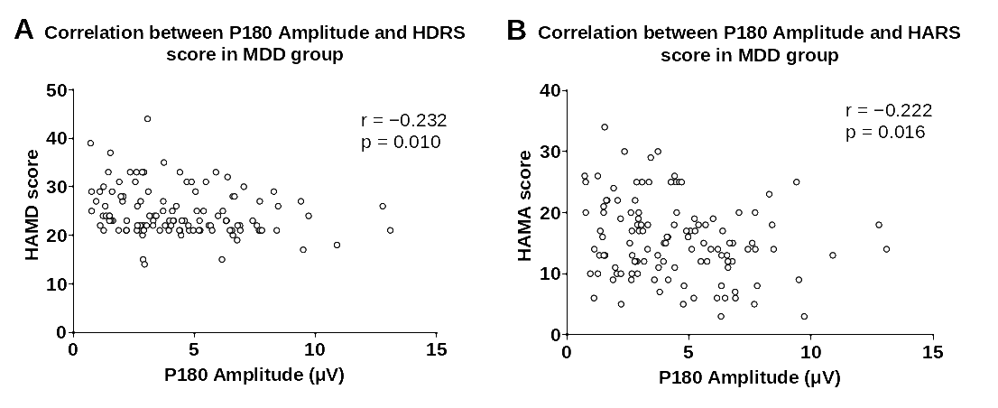 研究结果显示,抑郁症患者P180波幅显著低于健康对照人群。在抑郁症患者中,P180波幅与抑郁、焦虑症状得分呈显著负相关;P30波幅与RBANS视觉空间/结构得分和总分呈显著负相关。多元回归分析表明,P180波幅能负向预测患者的抑郁及焦虑症状;P30波幅、发病年龄和教育程度能负向预测患者的认知功能。