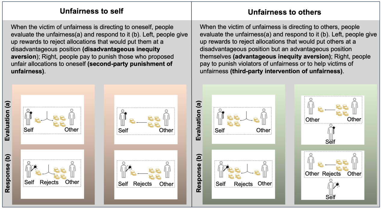 在资源分配情境中,个体对自我和他人的不公平待遇都有着强烈的厌恶(见图1)。然而,对于这两种类型的不公平之间的共通性和差异性尚无明确共识。许多神经影像学研究探讨了人们在上述两种情境下如何评价和回应不公平,但这些研究结果的一致性仍有待进一步调查。
