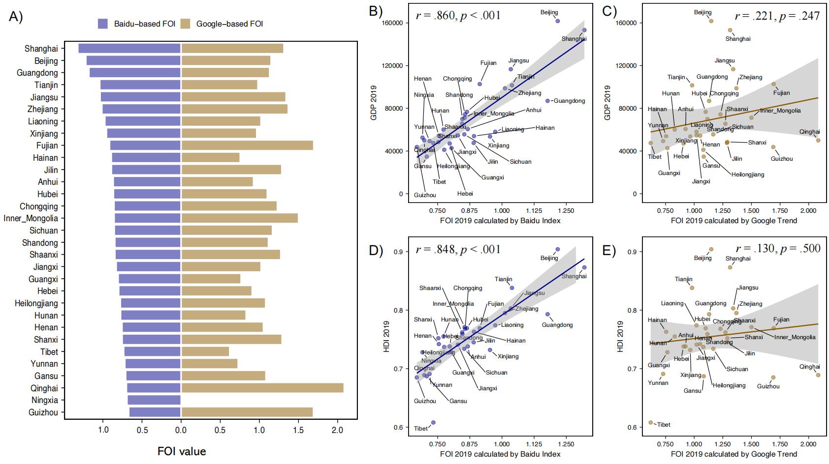 图1. A)百度(蓝色)和谷歌(棕色)未来搜索指数对比(以2019年为例);B / D)百度未来搜索指数与中国各省份人均GDP/城市发展水平的关系;C / E)谷歌未来搜索指数与中国各省份人均GDP/城市发展水平的关系。
