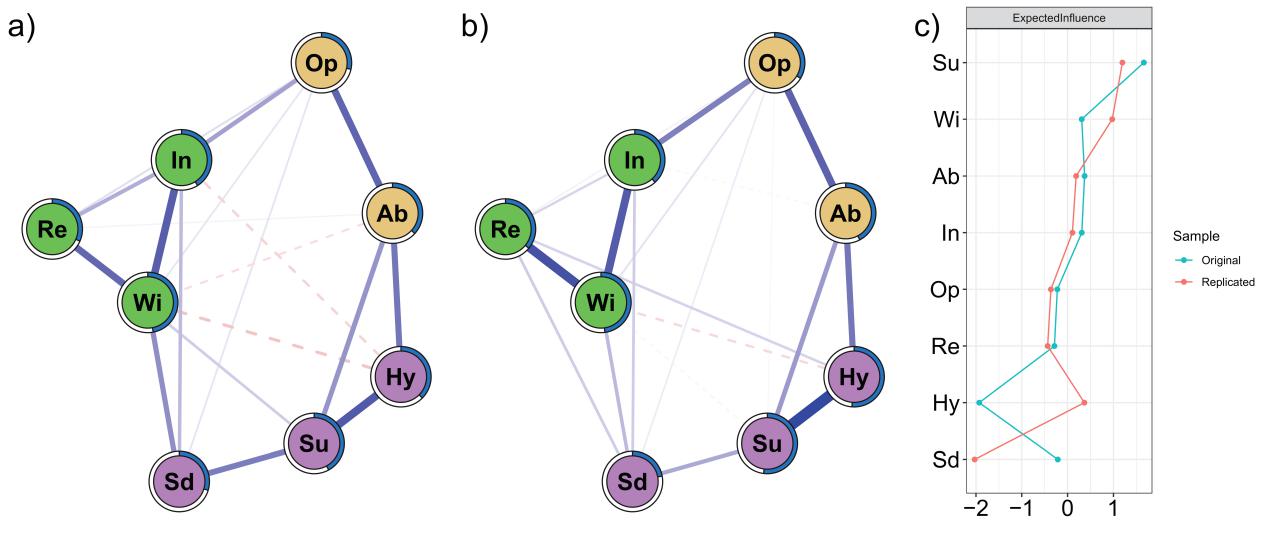 图2. a) 原始样本(n = 1037)和 b) 复制样本(n = 1385)的图形高斯模型;c) 原始样本和复制样本的GGMs的标准化EI估计