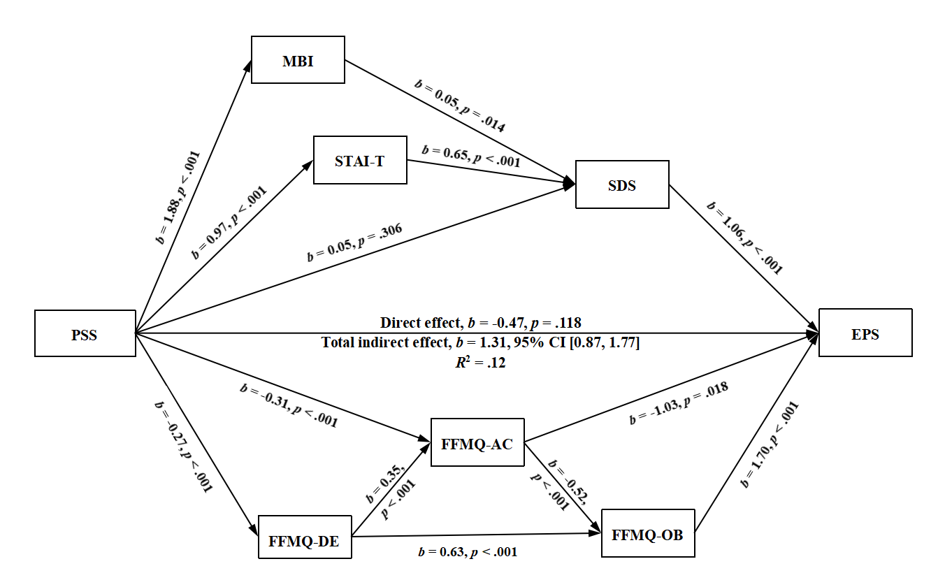 进一步的嵌套中介分析结果揭示,压力会通过加重心理“消极因子”(抑郁、焦虑、倦怠)、抑制“积极因子”(正念三元素:正念观察、正念描述、在觉知中行动),进而影响共情(图1,2,3)。随着上述因子水平在群体中的变化,压力感知大的个体对他人的情绪、音乐里的情感的共鸣也相应降低。