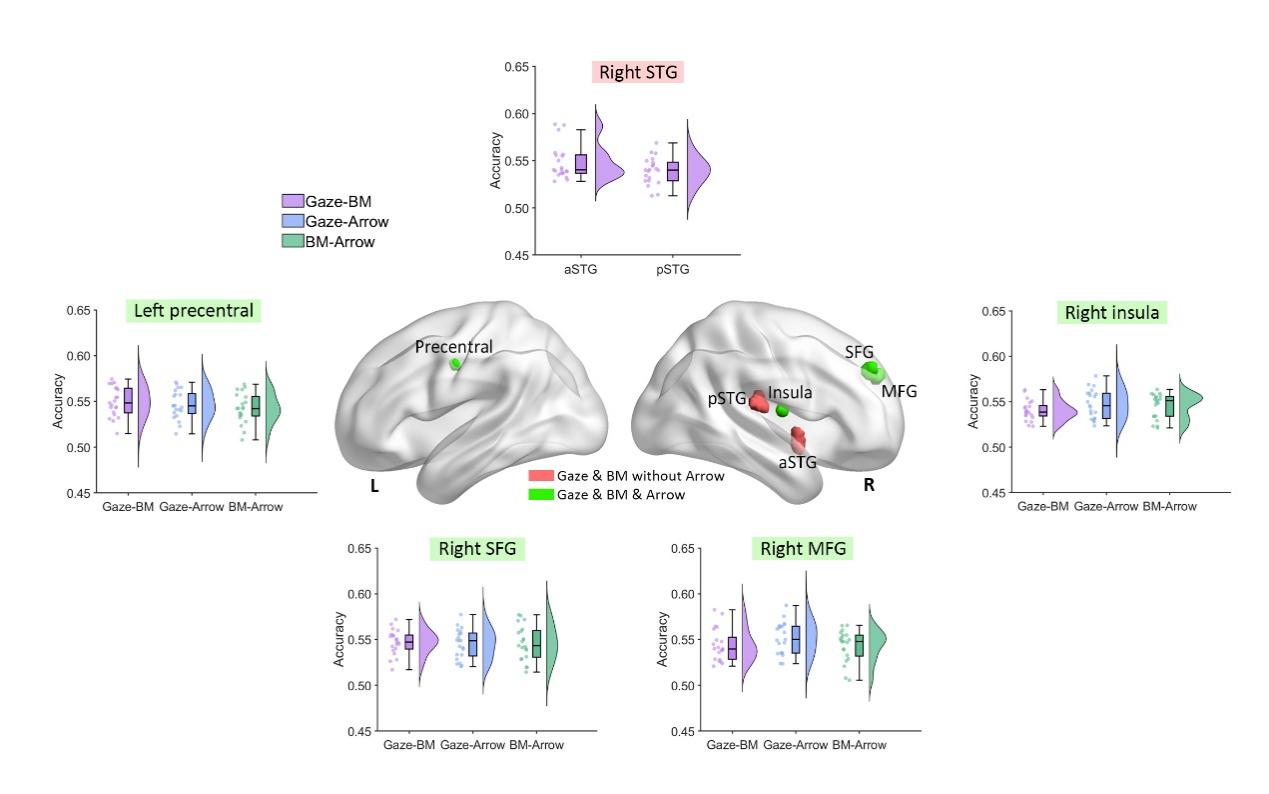 研究人员利用类别内多变量分析(MVPA)发现,眼睛注视线索诱发的注意效应在右侧后部颞上沟(pSTS)等区域的分类准确率显著高于随机水平;生物运动线索诱发的注意效应在右侧前颞上沟(aSTS)和左侧颞上回(pSTG)等区域的分类准确率显著高于随机水平(图2)。