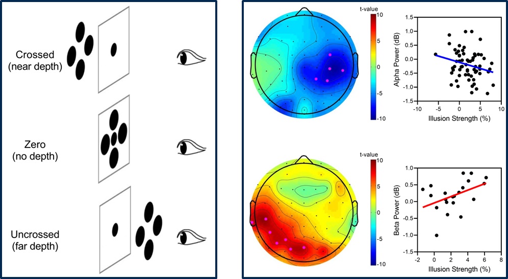 为了探究这一问题,脑与认知科学国家重点实验室蒋毅研究组的科研人员采用脑电技术开展了一项实证研究。研究采用双眼视差技术操纵艾宾浩斯错觉的中央目标圆和周围诱导圆的相对深度位置,使目标圆呈现在诱导圆的前方或后方,来干扰大小对比而不影响轮廓交互作用。同时记录脑电活动,考察alpha和beta振荡在该错觉加工中扮演的角色。