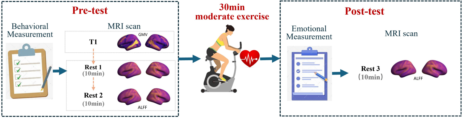 该研究包括了随机分配的运动干预组和控制组,运动组进行30分钟中等强度的有氧运动,控制组则进行无运动干预。所有被试在前测阶段均进行了2次分别持续10分钟的静息态磁共振数据扫描,后测的静息态扫描则需被试恢复安静心率水平后进行,持续时间10分钟。
