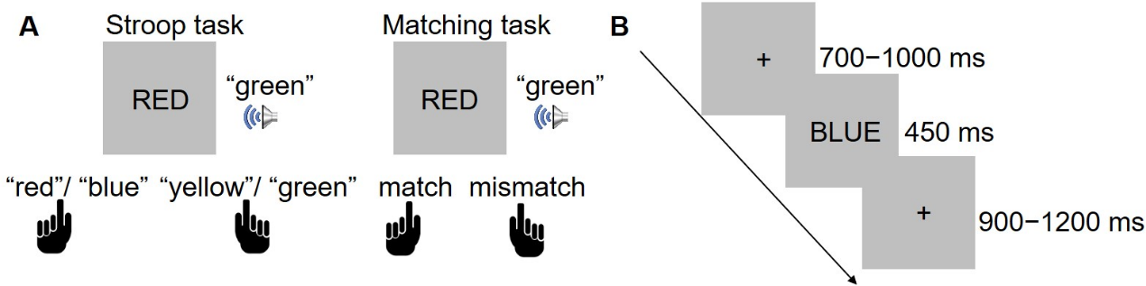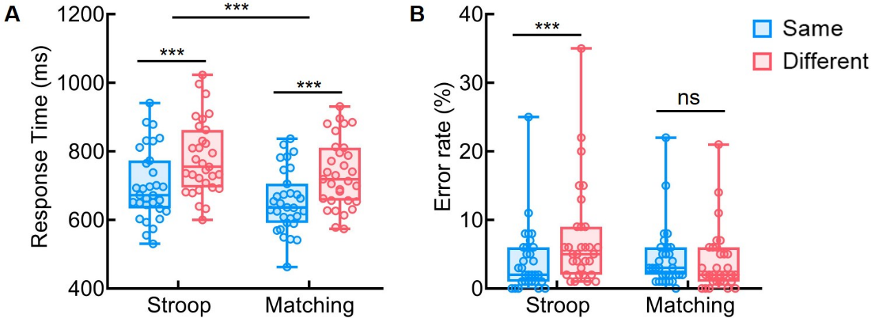为了回答该问题,永乐汇刘勋研究组的科研人员开展了一项研究,设计了视听Stroop任务(测量选择性注意)和视听Matching任务(测量分配性注意),并同时记录被试的脑电信号(N = 30)。两种任务的视听刺激相同,都包含相同和不同两种条件。但是两者指导语不同:Stroop任务要求被试对听觉刺激反应而忽略视觉刺激,Matching任务要求被试判断视觉和听觉刺激是否匹配(图1)。行为结果见图2,发现Stroop任务和Matching任务下的反应时在不相同条件下比相同条件下长。
