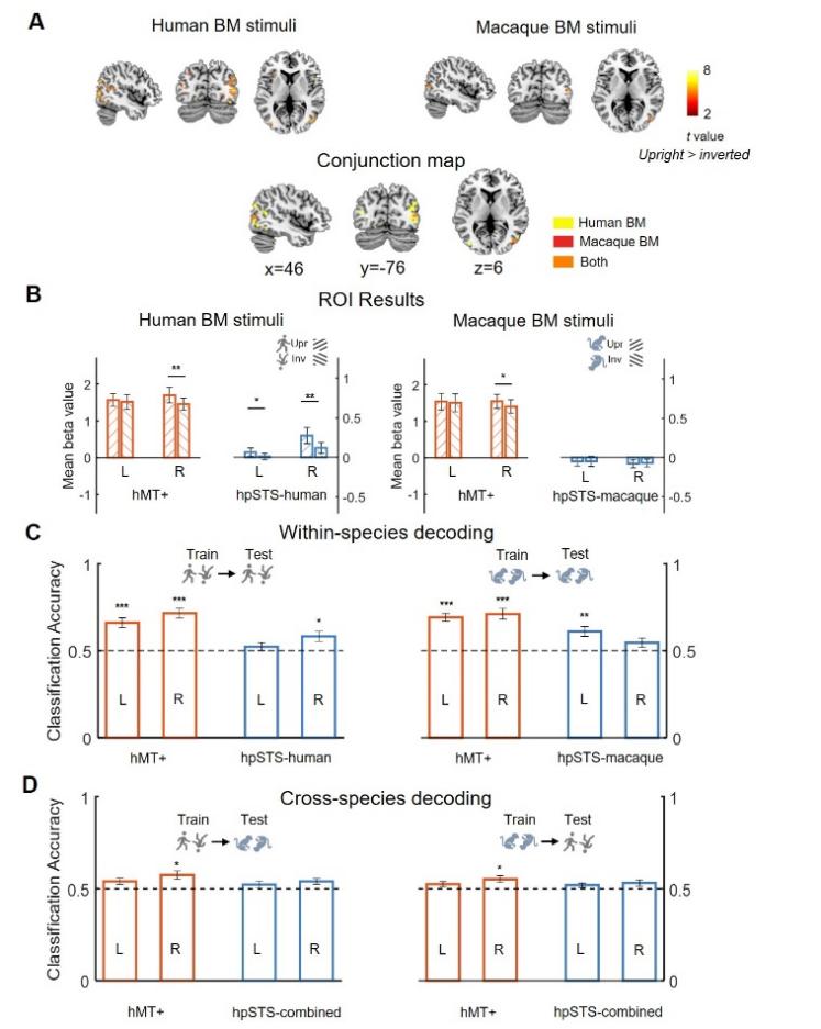 图2. 人类MT和pSTS对同物种和跨物种生物运动的反应