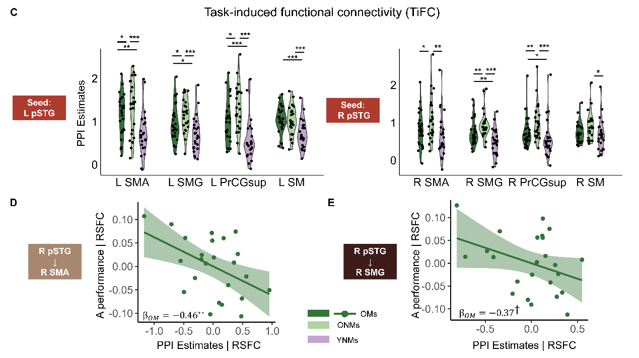 此次研究招募了三组参与者:具有30年以上乐器练习经历的老年音乐家(高认知储备组)、无音乐训练的老年人(低认知储备组)以及年轻对照组。在功能磁共振成像(fMRI)中,参与者完成了噪音下的音节识别任务。结果发现,老年非音乐家在完成任务时,听觉背侧通路的高级脑区与语音感知区域之间的功能连接显著增强,反映出代偿性活动;而老年音乐家的功能连接模式更接近年轻人(图2C),支持了“延缓上调”假设。脑-行为相关性分析进一步验证了这一观点:与年轻人更相似的脑活动强度,预示着更优的行为表现(负相关,图2D、F)。