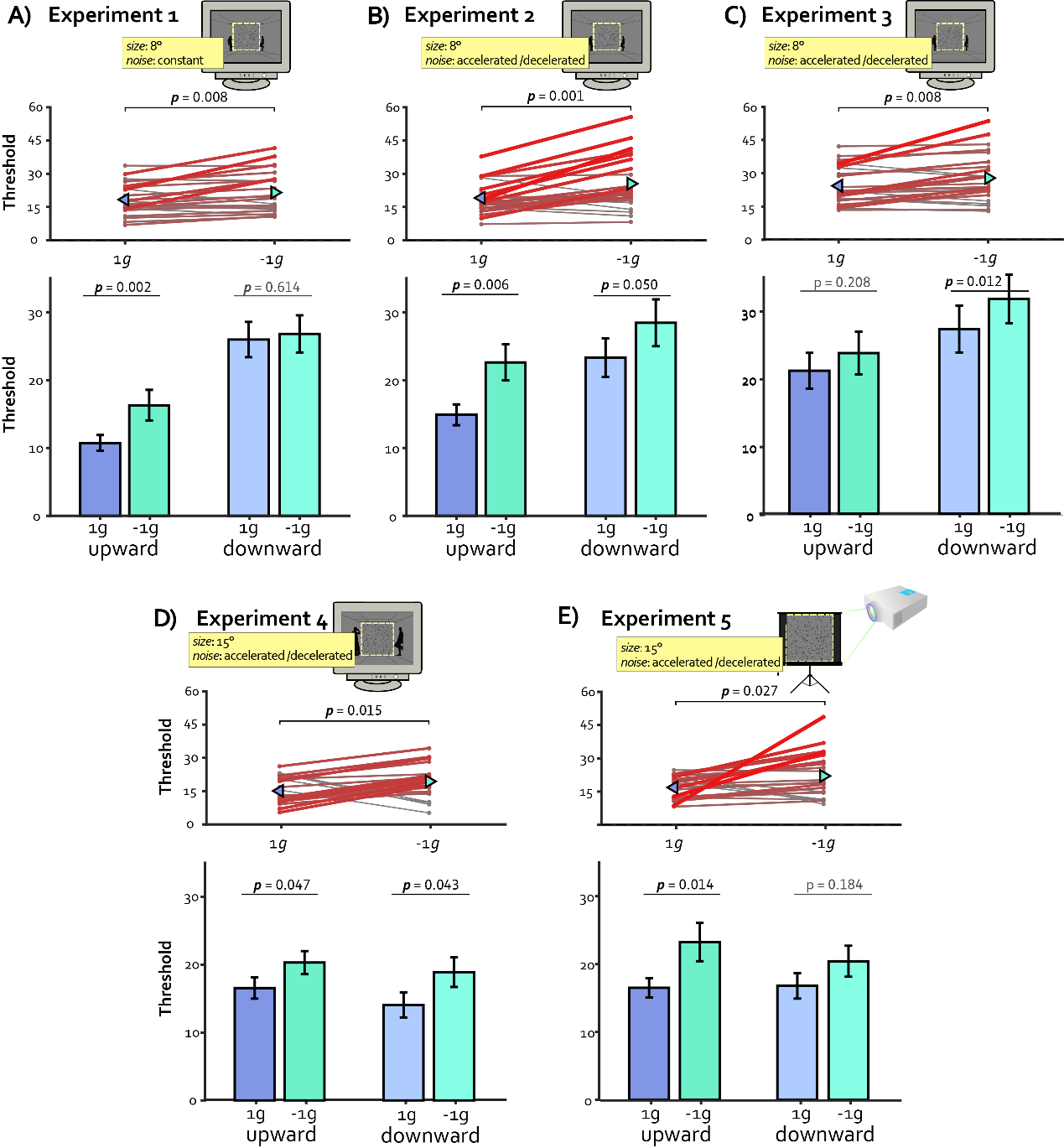 研究团队通过五个系统实验,利用心理物理法,比较了自然(1g)与反转(−1g)重力条件下人们从随机运动(噪音)中分辨一致性运动(信号)的知觉阈值(图1)。实验结果表明,无论背景噪声是否包含加速度、点的存在时间持久或短暂、刺激场景在虚拟坐标系(计算机屏幕)或真实世界坐标系(全尺寸投影)中呈现,人们始终更容易整合并辨别符合自然重力作用的运动信号(图2)。