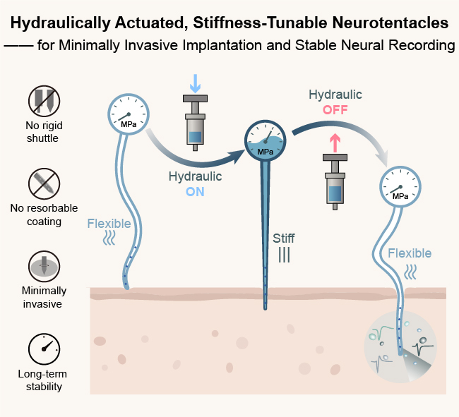 论文信息:Wang Y*, Xu X*, Yang X, Tang R, Chen Y, Zang S, Wang Y, Liang J.#, Pei W#. Stiffness-Tunable Neurotentacles for Minimally Invasive Implantation and Long-Term Neural Activity Recordings. Adv Sci (Weinh). 2025 Jul 21:e05100. DOI: https://doi.org/10.1002/advs.202505100