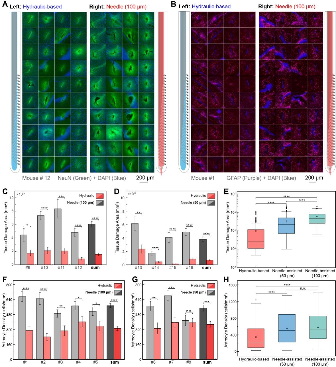 图2. 神经触手探针的超低急性损伤和慢性免疫反应