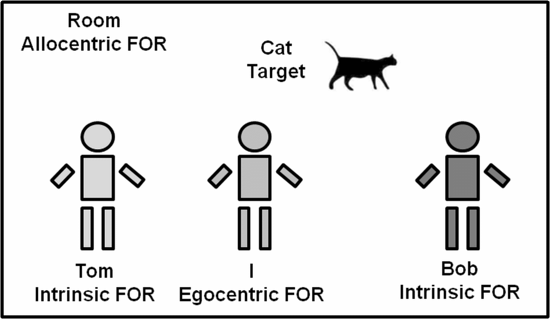 人们会运用多种参照系来表征空间信息,如自我参照系(以观察者为锚点),环境参照系(以外在的大的环境空间方位为锚点)和物体参照系(以环境中的物体为锚点)等。“参照系显著性地图(FORMS)” 理论指出,每种参照系表征都有其独特的显著性,这些参照系相互作用共同影响人们对空间信息的表征与加工。对于每个参照系而言,只有高显著性的物体或位置会获得更多的注意和更强的表征。因此,当执行一项需要以低显著性参照系而非高显著性参照系进行反应的任务时,这些参照系之间可能会产生冲突。根据涉及的参照系不同,基于参照系的冲突可分为以下四类:自我-环境参照系冲突、环境–物体参照系冲突、自我-物体参照系冲突以及物体-物体参照系冲突。在图1中,若要求观察者以Bob的视角判断猫的位置,答案是猫在Bob的左侧。然而,猫在观察者的自我参照系的右侧,这与在Bob的视角相反,产生了自我-物体参照系冲突。同理,猫在Tom的物体参照系的右侧,与Bob的视角也相反,产生了物体–物体参照系冲突。