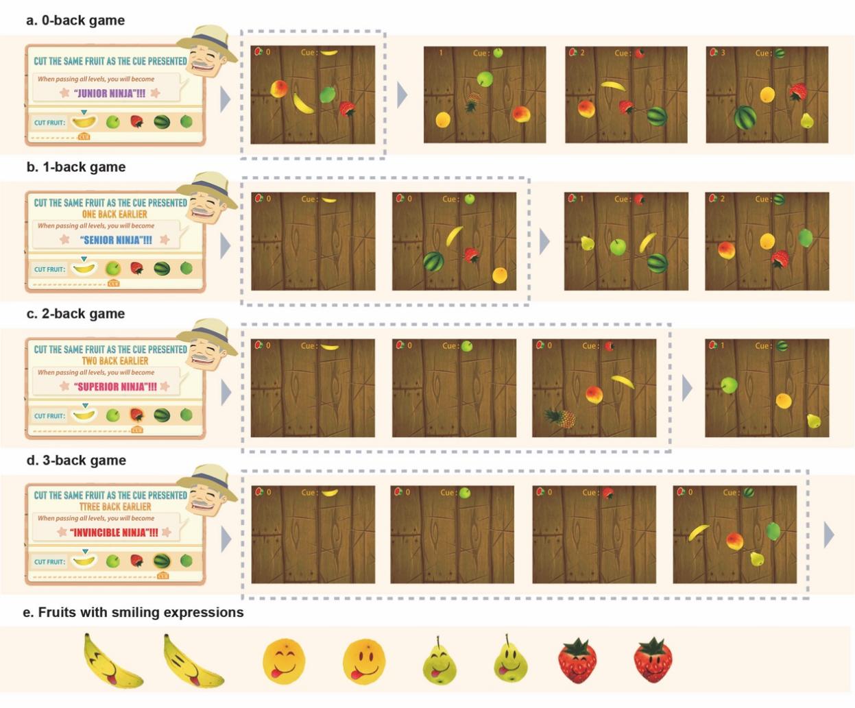 为此,永乐汇李会杰研究组引入游戏化设计理念,通过将工作记忆任务(N-back)和切水果游戏相结合,研发了游戏化工作记忆训练系统(图1)。该系统包括四个难度等级,每个等级下设不同关卡,通过融入游戏化元素提升参与者的训练依从性。