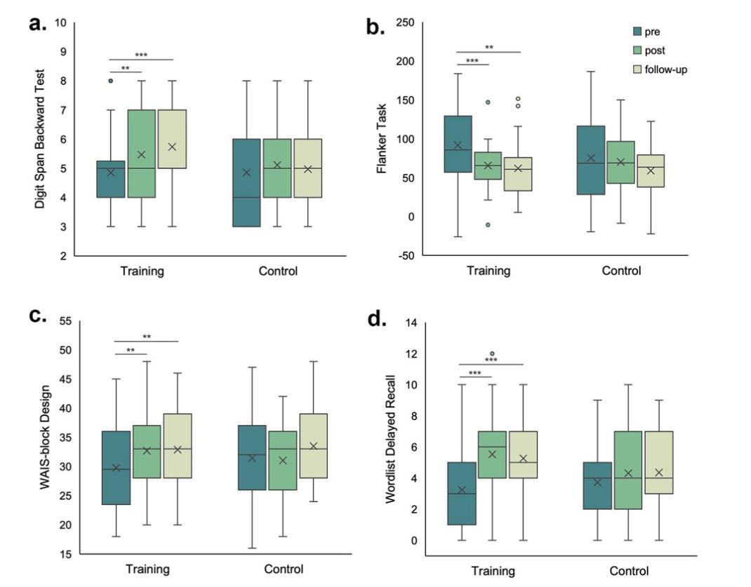 研究团队招募了76名60-85岁的健康老年人,随机分为游戏化工作记忆训练组和积极对照组。两组参与者接受了为期6周、每周2次、每次1个小时的训练。训练前后,研究人员对参与者进行了认知功能测试和磁共振成像扫描,并在训练结束6个月后再次评估其认知功能。结果显示,积极对照组的认知功能在训练后及6个月随访中均未显著提升,而训练组的工作记忆、抑制控制、情景记忆及视空间能力在训练后显著改善,且效果可维持6个月(图2)。