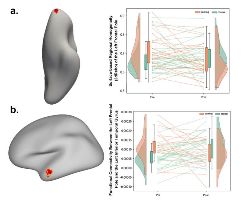 在神经层面,训练组老年人在6周干预后,左侧额极的皮层厚度显著增加(图3),同时左侧额极的局部功能一致性及左侧额极与左侧颞下回的功能连接显著降低(图4)。这表明游戏化工作记忆训练能够有效缓解老年人脑结构的随龄衰退,提升脑功能的神经加工效率。进一步分析显示,老年人工作记忆改善与额极结构和功能的变化高度一致,提示额极是支撑老年人工作记忆改善的重要脑区。