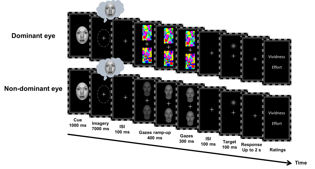 既然想象能有效地引导人们对颜色、一般物体等普通信息的注意,那么一个有趣的问题便浮出水面:这种效应能否作用于更高级的社会性信息呢?人类是社会动物,他人的目光注视以及肢体动作都是至关重要的社会线索。这些线索具有方向性,能提示他人所关注的位置并传递他人意图。如果在脑海中预先想象一个社会线索(例如眼睛的注视方向),人们是否会因此对现实中出现的同方向社会线索更加敏感呢?