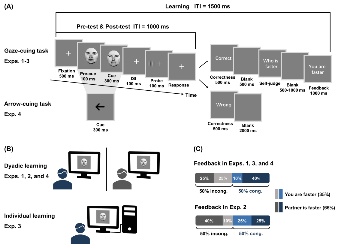 过去二十多年间,围绕社会性注意的研究取得了丰硕成果。然而,这些开创性工作大多基于“单被试”实验范式,即每次实验仅由一名被试单独完成特定任务。但在现实生活中,人们的日常活动通常发生在他人在场的社会情境里,个体行为也持续受到社会情境的塑造与调节。由此引出一个关键问题:这种在成人阶段被认为相对稳定的社会性注意能力是否会受到社会情境的影响呢?更进一步,如果这种影响确实存在,又会如何受到互动同伴的具体特征的调节?