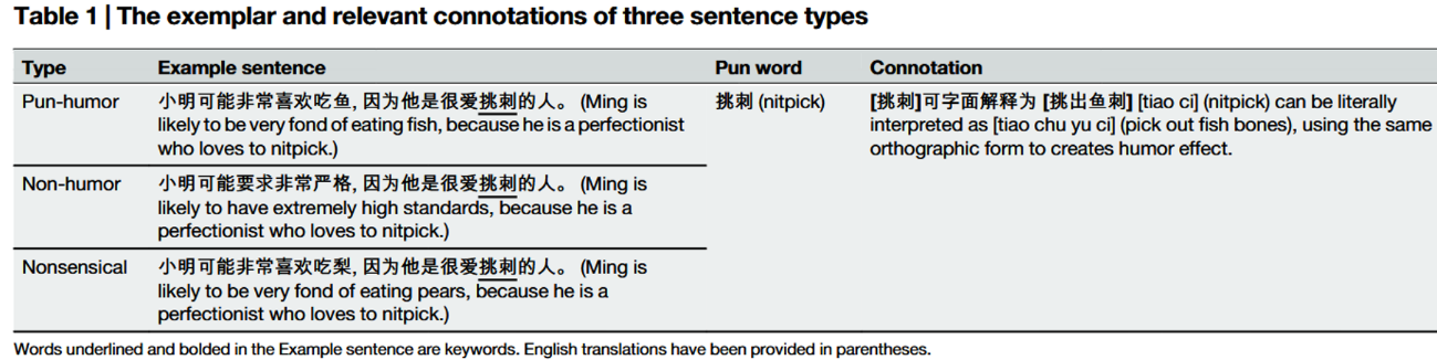 研究团队设计了三类包含相同负面关键词的中文句子:双关幽默句(Pun-humor, 如“小明可能非常喜欢吃鱼,因为他是个爱挑刺的人”)、非幽默句(Non-humor)和语义无关句(Nonsensical)(见表1)。通过行为评分与脑电记录,系统考察被试在实时理解语言时的情绪体验。
