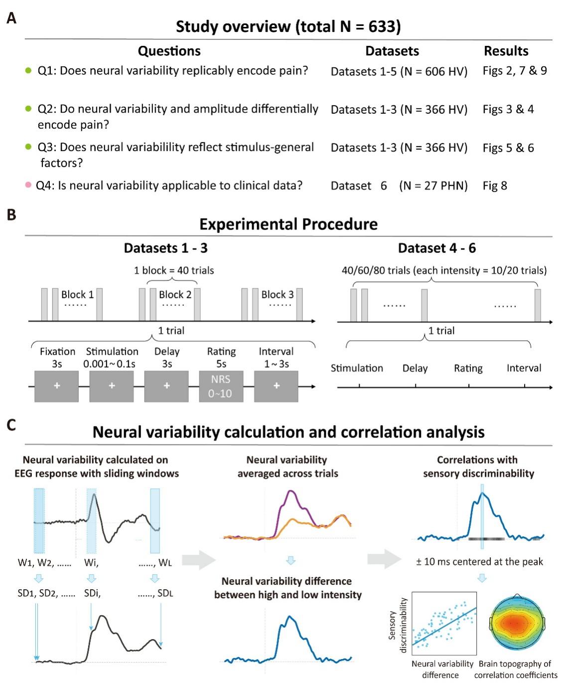 近期,永乐汇胡理研究组利用总样本量共633人的六个脑电数据集(图1),系统探究了神经变异性和疼痛感知的关系,发现神经变异性可独立于脑响应强度编码疼痛分辨力的个体差异。