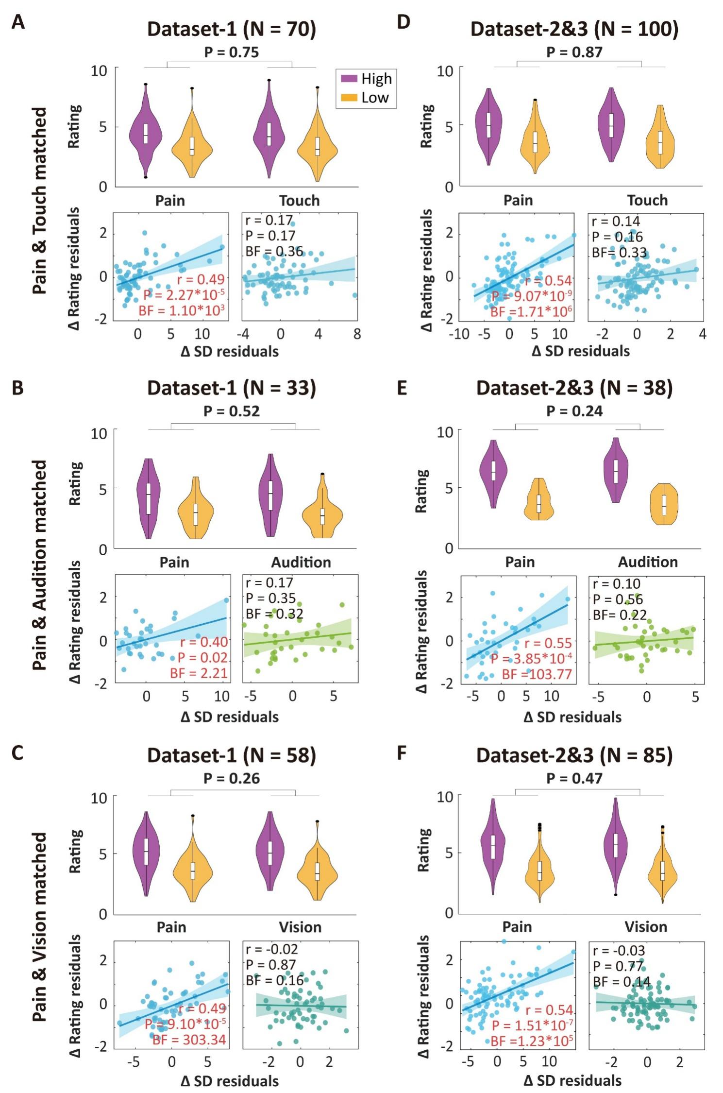 接着,研究团队考察了神经变异性和疼痛分辨力的关联是否是疼痛特异的。分析结果显示,神经变异性无法显著编码触觉、听觉、视觉三种典型非痛感觉的分辨力。即便控制了不同感觉模态的强度评分差异,神经变异性也依旧只能显著编码疼痛分辨力(图4)。可见,神经分辨力能够特异性编码疼痛分辨力。