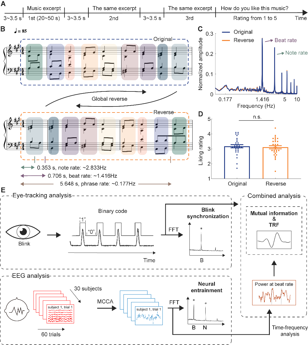 研究结果发现,即使没有刻意控制或有意识的觉知,受试者的眨眼频率仍会精准对齐音乐节拍(图2A)。同样,脑电波也呈现出同步振荡,仿佛大脑内部有个“节拍器”在指挥(图2D)。