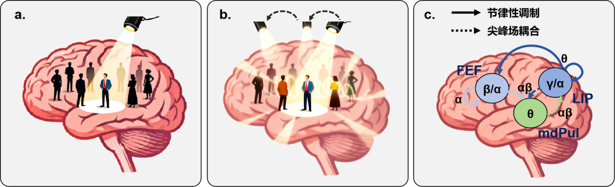 已有研究发现,当注意需要分配到多个位置时,人类乃至猕猴的行为表现会出现每秒4~8次的周期性波动,仿佛聚光灯在有节奏地“闪烁”(图1b)。这表明,注意更像是一盏按特定节奏在采样的动态聚光灯,这一机制被称为 “注意的节律采样”。即便注意聚焦于单一位置时,该机制也持续运行,以保持动态灵活性。基于人类和灵长类动物的电生理研究,科学家进一步揭示了其涉及大脑多个脑区之间的神经振荡协同(图1c)。