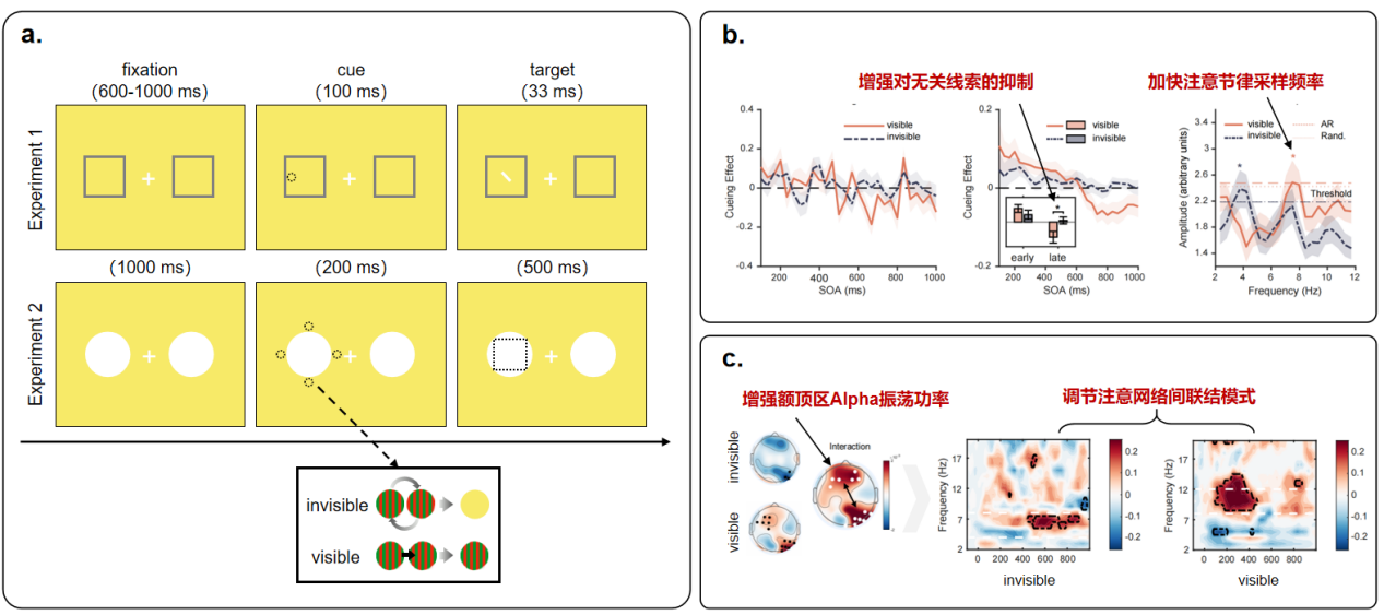 a.实验流程图;b.不同意识水平线索引发的注意转移效应,其缓慢变化趋势以及快速的振荡功率谱;c.不同意识水平线索调节额顶区和右偏侧顶枕区alpha功率变化,以及其两个注意脑区之间联结模式的差异