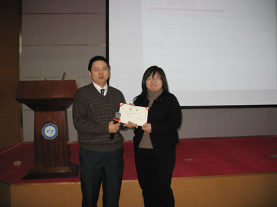 学术报告环节由研究室各个课题组推荐的9个学术报告组成。这9个报告分别是:吴丽丽助理研究员代表蔡华俭课题组报告:“积极自我偏差:来自ERP 的证据”;郑蕊助理研究员代表李纾课题组报告:“是钱,还是人情决定了你的地区依恋感:19个城市的多层线性模型分析”;孙彦助理研究员代表李纾课题组报告:“判断与决策中的图形突出效应”;张亮助理研究员代表孙向红课题组报告:“视听双通道表情加工的注意调控”;研究生吴梦代表王詠课题组报告:“共享心智模型影响团队绩效的权变模型”;研究生张警吁代表王二平课题组报告:“威胁状态下政治信任的变化”;研究生庄想灵代表吴昌旭课题组报告:“无人行横道处行人过街行为建模”;研究生袁怡然代表张侃课题组报告:“震后应激障碍患者对变化的觉察更加敏感”;研究生陈正根代表张雨青课题组报告:“不同民族创伤后应激反应模式比较的质性研究”。