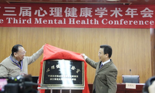 浙江师范大学副校长李伟健教授和心理所前所长张侃研究员为联合建立的心理健康实验室揭牌