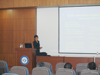 在题为“使用高密度脑电技术将功能和结构相连接-基础和临床研究中SOBI技术简介(Mapping functions to structures inexpensively using high-density EEG--- SOBI as an enabling technology for basic research and clinical investigation)”的报告中,Tang教授首先介绍了脑电图(EEG)与大脑功能和结构的关系问题,引出了传统方法对EEG数据进行信号分离的局限性。然后,Tang教授重点介绍了SOBI信号分离方法在EEG中的用法,并报告了他们对这一方法的验证结果,证实了这一方法具有高度的可靠性和运算速度,并且在认知神经科学领域有着广泛的应用。它不仅可以用于分析EEG、事件相关电位(ERP)数据,还可以分析脑磁图(MEG)、功能磁共振(fMRI)等数据。最后,Tang教授介绍了SOBI在大脑方向性功能连接中的应用。该报告不仅给我们带来了新的脑电源分析技术,而且提供了新的思维方式,使我们仅仅使用脑电这一简单又便宜的技术就能达到功能和结构连接的目的。