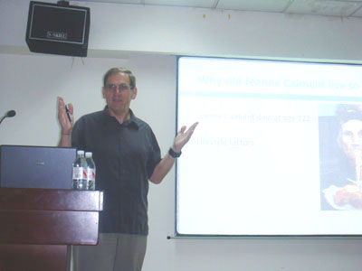 6月1日,McGue教授在心理所421会议室作了精彩的学术报告,心理所的科研人员和学生参加了报告会。会议由张侃所长主持。在题为“心理学家应该了解的人类基因组计划(What every psychologist should know about the Human Genome Project)”的报告中,McGue教授首先回顾了科学家探寻人类行为与精神障碍相关基因的历程以及人类基因组计划的重要成果,然后讨论了当前国际常用研究策略的局限性,并展望了行为遗传学研究未来的发展前景。接下来,在题为“长寿的本质与缘由:丹麦纵向研究获得的证据(The nature and origins of exceptional aging: evidence from Danish longitudinal studies)”的报告中,McGue教授介绍了一项他与丹麦科学家合作的关于长寿的纵向研究,并通过这项研究,展示了如何将量化行为遗传学、遗传流行病学和现代分子生物学的研究手段有机地结合起来以揭示科学问题的本质。