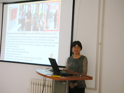 王茜的讲座针对“虎妈与孩子的高成就”这个社会热点问题,通过为期四年的纵向追踪研究,对比了中美文化环境下父母对孩子的控制程度及其对孩子的学习动机和情绪的影响,研究结果表明,父母对孩子自主决定的鼓励会提高孩子的学习动机和情绪上的愉快体验。该研究成果分别发表在2007年和2009年的Child Development杂志上。这是许多家长和教师非常感兴趣的话题,报告中,与会老师和研究生与报告人王茜进行了热烈的讨论。