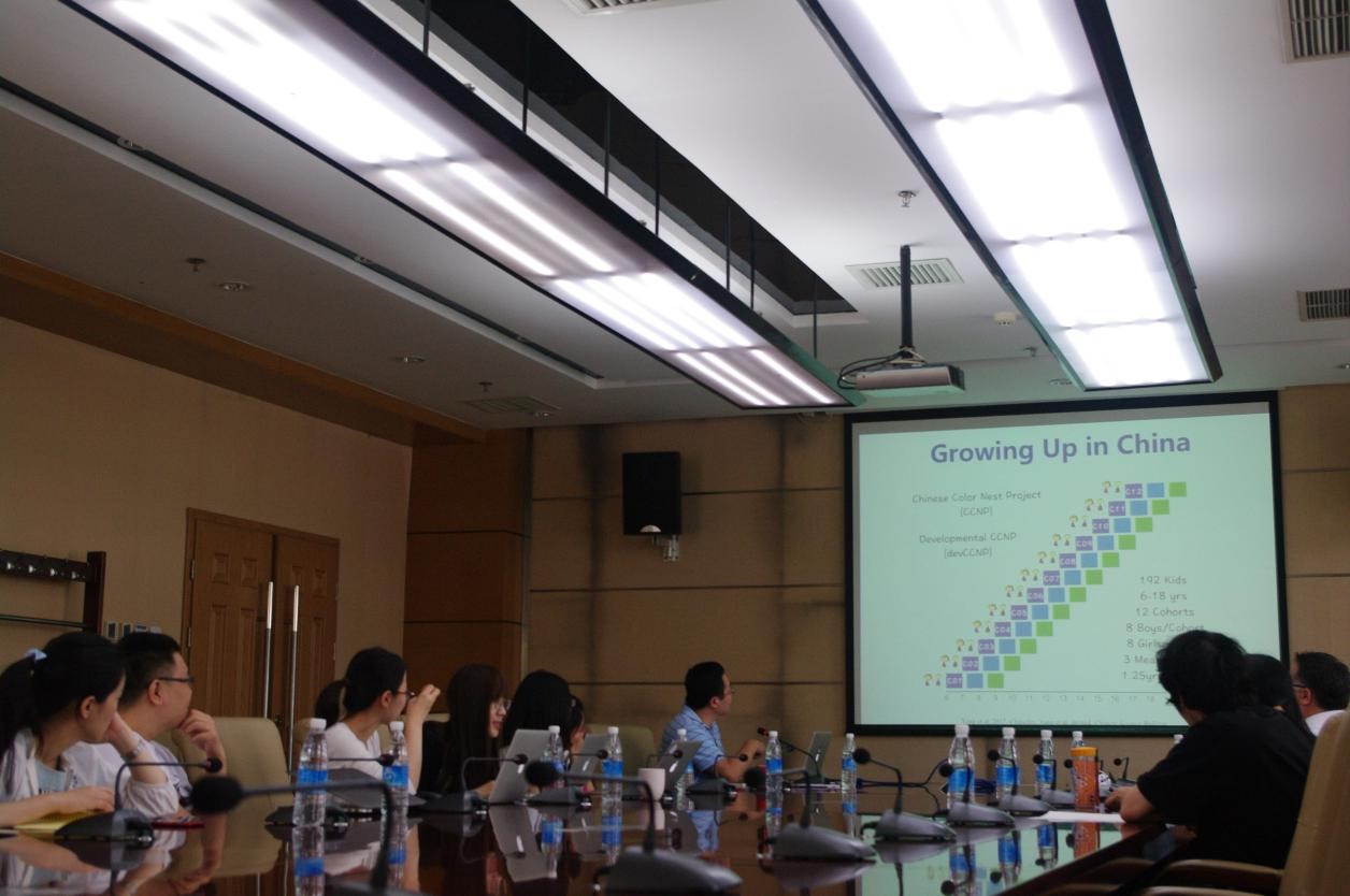 左西年首先介绍了总体项目情况,随后他带领的毕生人脑连接组学与行为研究团队成员详细介绍了中国儿童脑发育“彩巢计划”项目的相关情况。“彩巢计划”是一项旨在绘制中国学龄儿童脑与行为生长曲线的大型实验项目,项目采用加速纵向实验设计方法,计划未来十年内在全国范围分期分步采集各年龄阶段的心理行为与脑样本数据,建立中国人脑毕生发展的常模轨线。目前,项目已完成重庆市北碚区学龄儿童的数据采集。会议期间,左西年研究组成员详尽汇报了项目的概况、实验设计、实验方法与材料、实验进展等。Beckmann对“彩巢计划”表示肯定与赞赏,也对项目提出了宝贵意见。